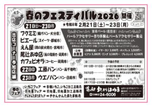 「道の駅北川はゆま 春のフェスティバル2026」開催(令和8年2月21日(土)~23日(月)) 期日:令和8年2月21日(土)~23日(月) 出店コーナー参加店舗 2月21日(土):フクミミ(揚げパン・大分県)、ピエール […]