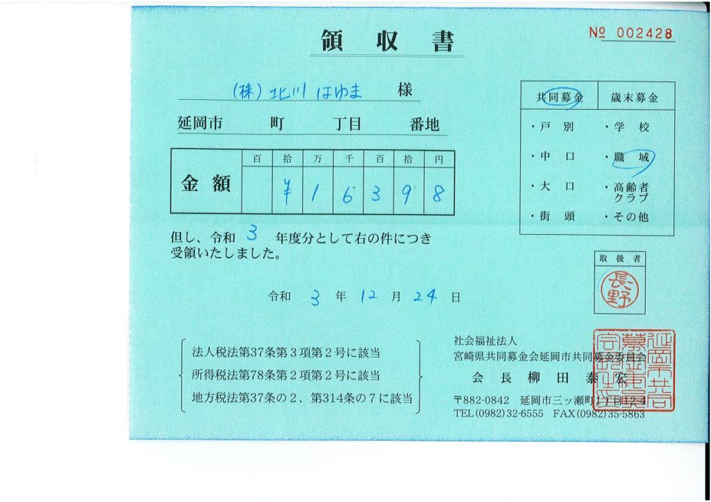 「道の駅北川はゆま」お土産館レジで皆様よりご協力いただいておりました「赤い羽根共同募金」については「延岡市共同募金委員会」へお届けいたしました。