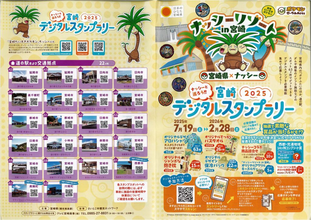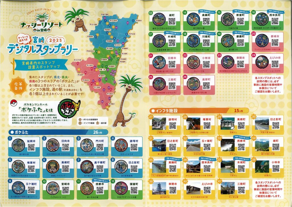 宮崎県内の「ポケふた」のほか、道の駅、ダムや橋等のインフラ施設などのスポット63ヶ所でゲットできるデジタルスタンプを必要個数集めて応募すると素敵な賞品が抽選で当たります。